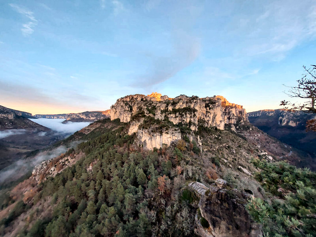 Perché au-dessus du Rozier, à la confluence des gorges du Tarn et de la Jonte, Cap-Luc est un rocher occupé dès l’Antiquité, que les Romains surnommaient Caput Lucis, « la tête de lumière ». Au Moyen Âge, un château fort y est édifié pour contrôler les vallées et sécuriser le passage entre Causses et gorges. On y trouvait murs, tour, citerne creusée dans la roche et une petite chapelle, dont il ne subsiste aujourd’hui que quelques traces. Le site fut marqué par des sièges, des rivalités seigneuriales et même servi de refuge pendant les guerres de Religion. L’accès actuel, aidé par des échelles installées au XIXᵉ siècle, permet d’atteindre ce belvédère vertigineux. Passer une nuit en paroi à Cap-Luc, c’est dormir sur un promontoire chargé d’histoire et baigné du premier comme du dernier soleil.