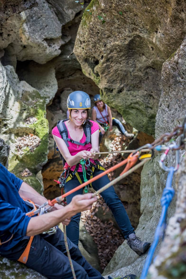 Encadrés pas à pas, les participants apprennent à manipuler la corde et à descendre en douceur dans le lit de l’ancienne rivière.